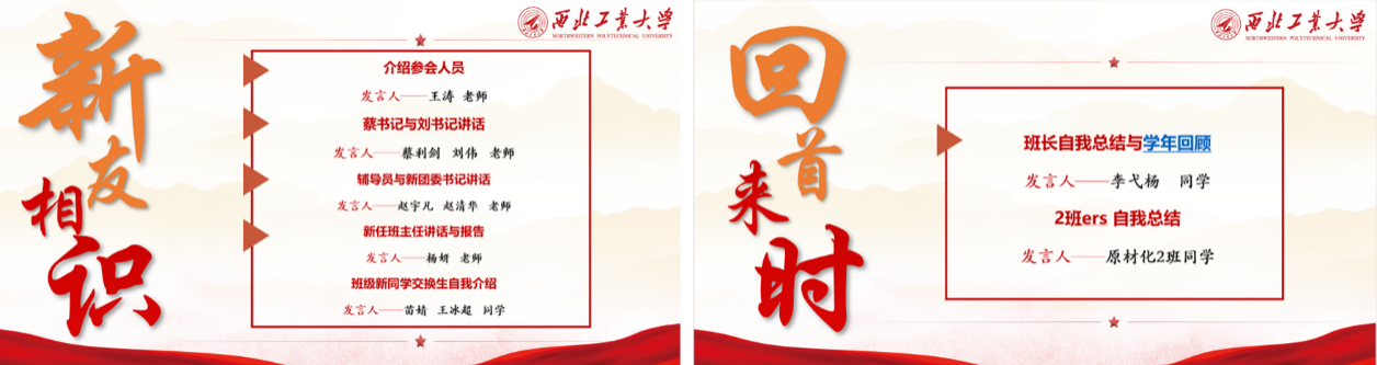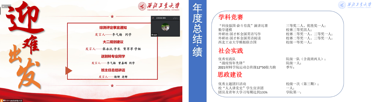 班长李弋杨作班级的学年回顾,总结了过去一年取得的成就荣誉,并结合班级成绩分析了存在的问题。随后,班级同学分别总结了自己一年的收获与不足,并对大二生活进行了展望。