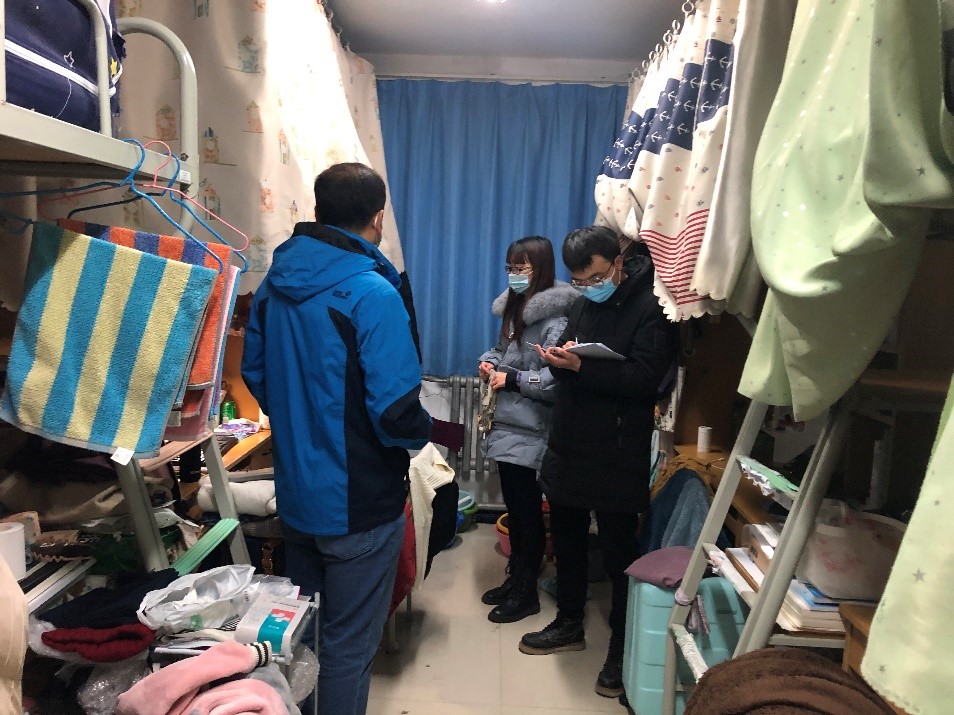 在检查过程中,刘建喜及宿舍管理委员会干事对每个寝室的安全卫生、通风情况以及用电安全进行了仔细检查,也对学生的住宿日常生活进行了解。此阶段是2019级硕士完成毕业论文的重要阶段,刘建喜提醒大家在完成学业之余适当缓解压力,保持寝室卫生干净整洁。