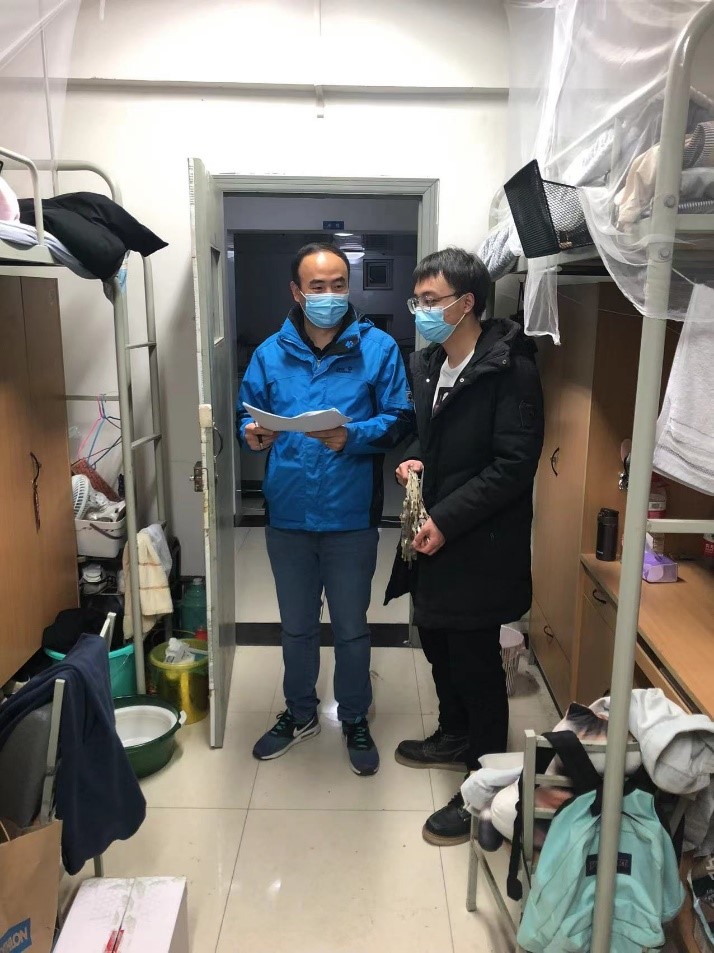 2019级硕士辅导员刘建喜老师及宿舍管理委员会干事对学生2019级硕士研究生宿舍进行全面安全检查。