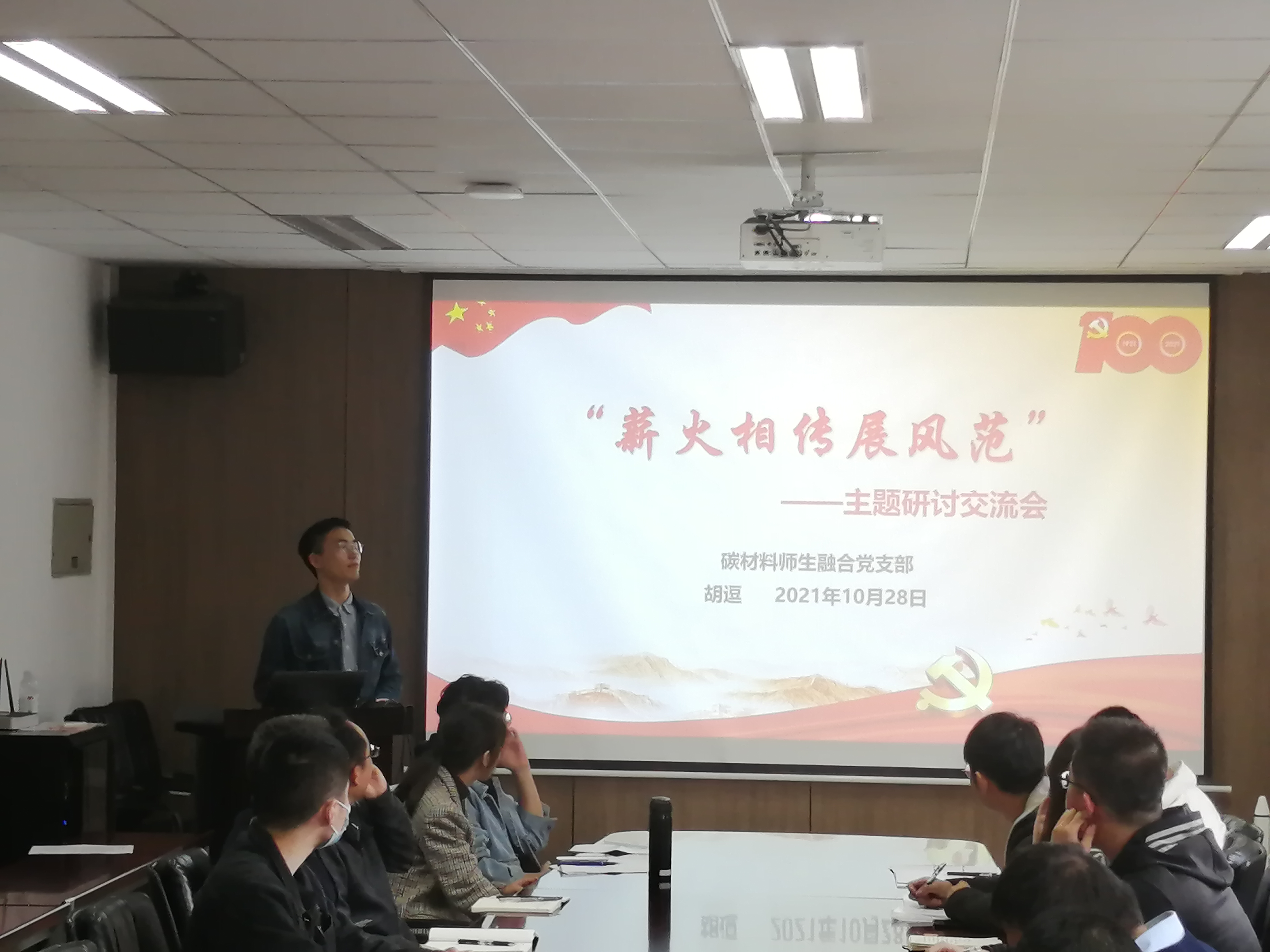 首先,由学生样板党支部——碳材料师生融合党支部和金属第一研究生党支部做工作经验分享。胡逗和邓妮同志围绕党员教育发展、弘扬“传、帮、带精神”、“外学内进,内促提升”等方面进行经验的分享,并深入浅出地分享了他们支部建设发展的经验,帮助大家对标对表找差距、聚焦不足谈整改。