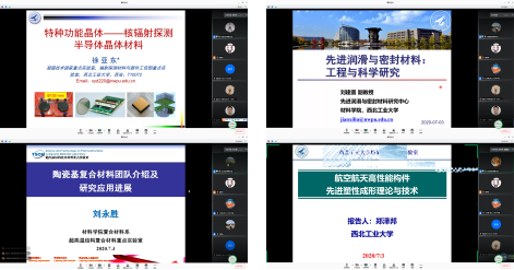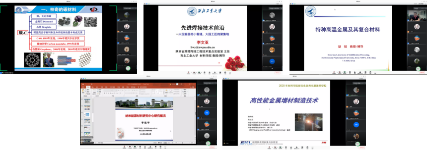 共安排九场学术讲座,付前刚教授、李文亚教授、胡锐教授、李炫华教授、杨海欧副研究员、徐亚东教授、刘建喜副教授、刘永胜教授和郑泽邦教授分别围绕“高性能低成本碳碳复合材料”“先进焊接技术前沿”“特种高温金属及其复合材料”“纳米能源材料”“高性能金属材料的增材制造”“特种功能晶体——核辐射探测半导体晶体材料”“先进润滑与密封材料工程与科学研究”“陶瓷基复合材料团队介绍及研究进展和航空航天高性能构件先进塑型成形理论与技术”等题目展开了内容丰富的宣讲,师生双方通过屏幕进行了精彩热烈的讨论,学生们收获颇丰。