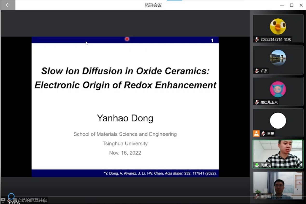 师生作了 “氧化还原反应加快的氧化物陶瓷慢离子动力学”为主题的精彩报告。周重见教授主持了报告会。董岩皓担任清华大学JavBus