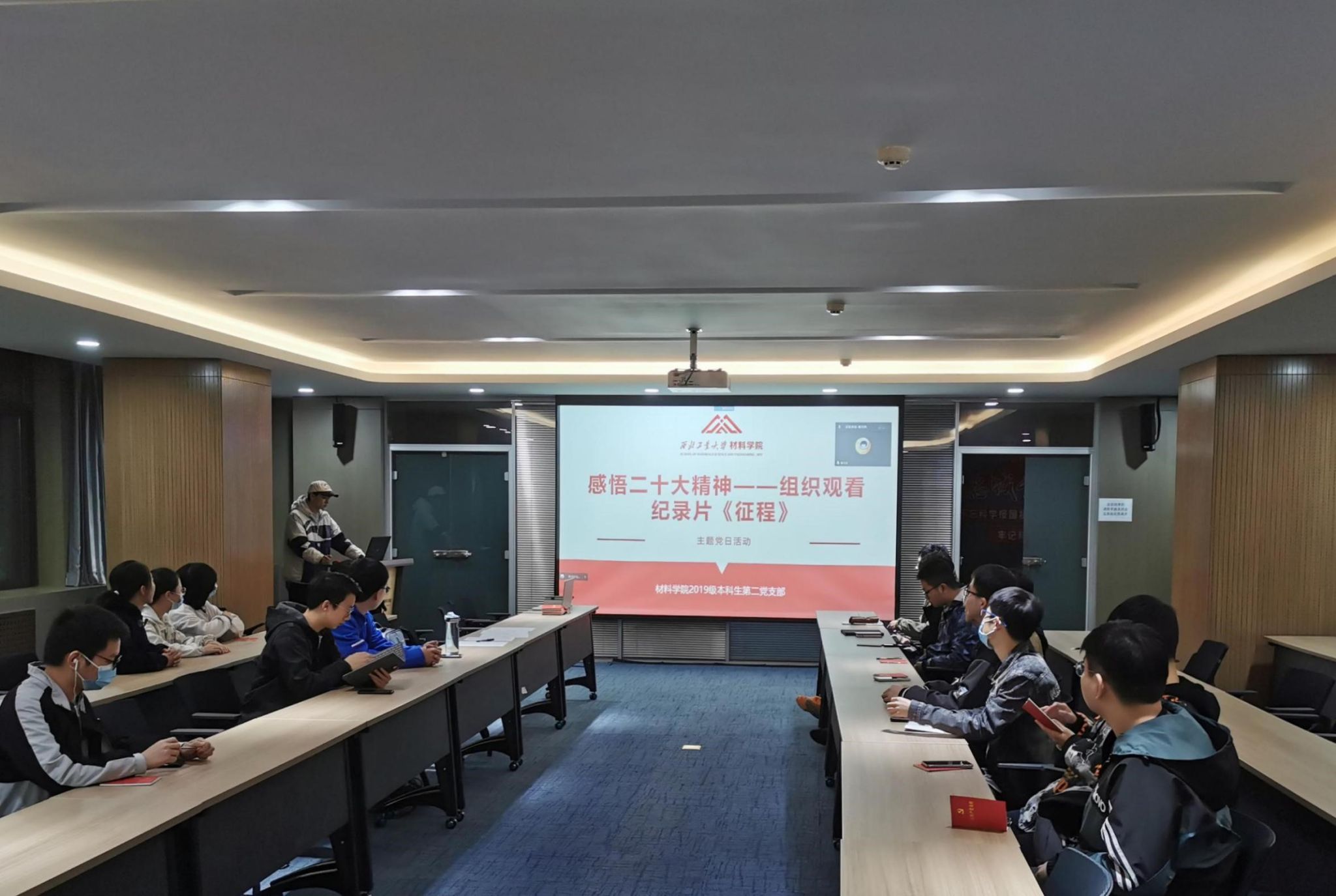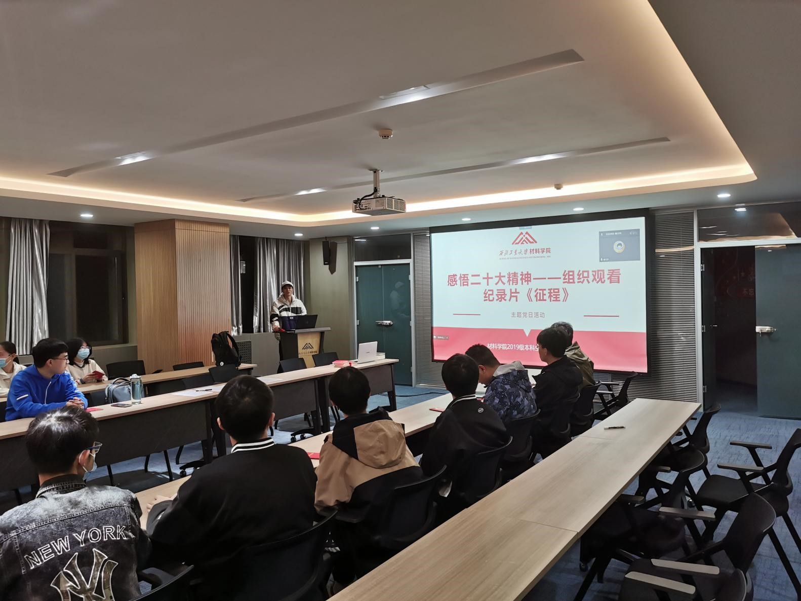 2019级本科生第二党支部于11月13日晚在研究生东馆411会议室召开了“感悟党的二十大精神——组织观看纪录片《征程》”主题党日活动,党支部书记贺亦柏、党支部全体党员以“线上+线下”的形式参加活动,支部副书记吴昊泽主持活动。