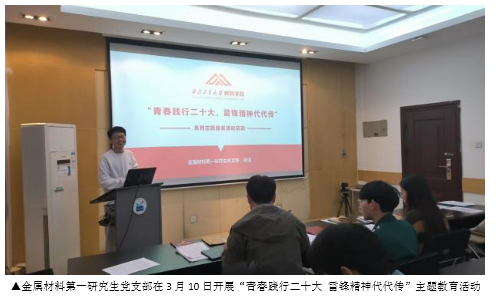在学习雷锋精神的号召下,金属材料第一研究生党支部在3月10日开展“青春践行二十大,雷锋精神代代传”主题教育活动。会上,支部书记杨浩通过云游雷锋纪念馆的方式帮助支部成员学习雷锋故事和雷锋精神。“作为党员,我们应该时刻牢记党的教育,为群众树立良好的榜样。学习雷锋的精神,坚定自己热爱党、热爱祖国、热爱社会主义的信念,在工作中兢兢业业,在生活中助人为乐,在作风上勤俭节约”,党支部通过这次会议鼓励大家把崇高理想信念和道德品质追求转化为具体行动,关注群众的需求,在工大校园中传承和发扬雷锋精神并启动了支部学习雷锋精神系列志愿活动。