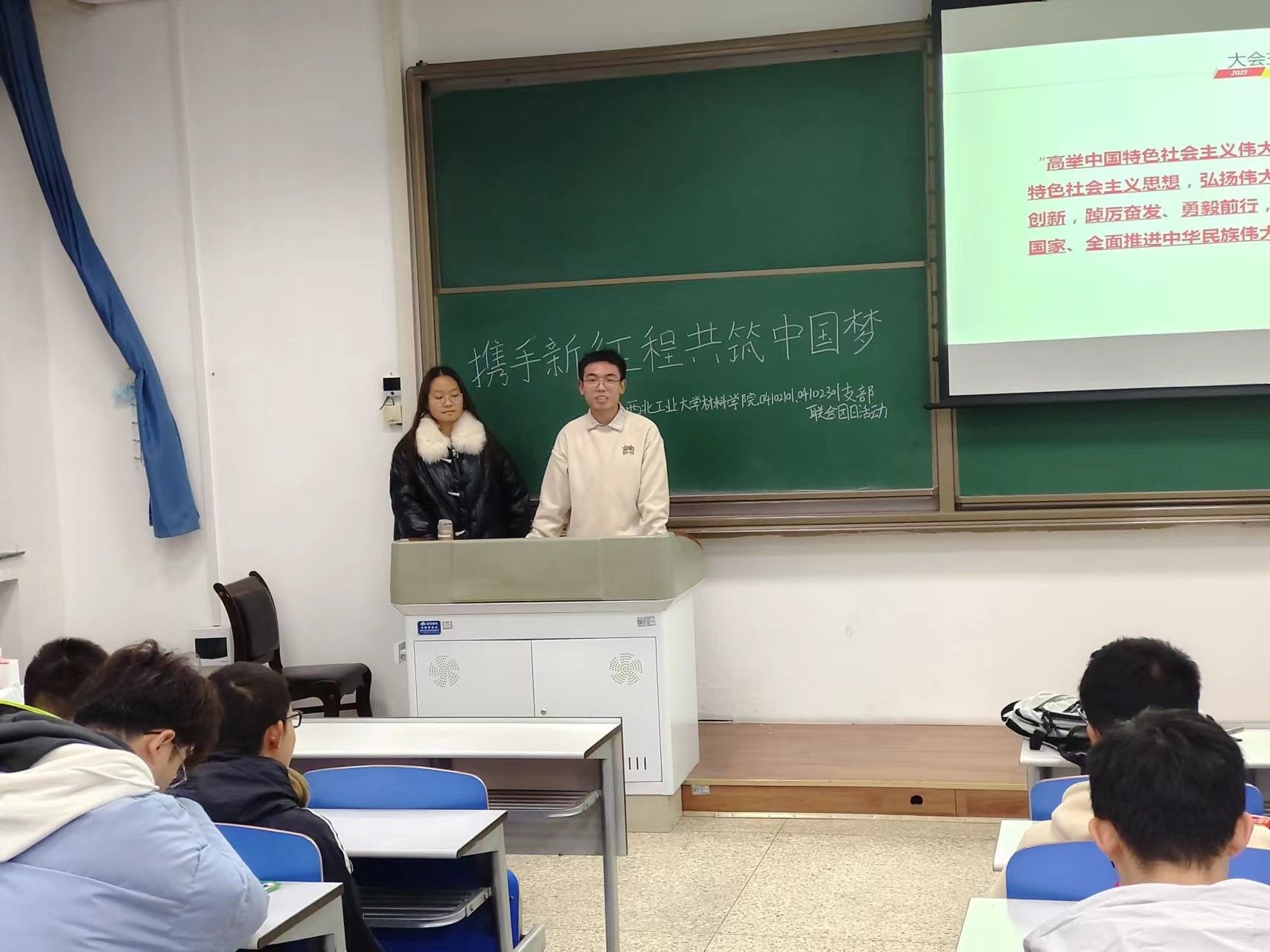 04102101支部(五好四型“组织型”样板团支部)与04102301支部联合开展了“携手新征程,共筑中国梦”主题团日活动,共同完成了理论讲解、知识竞答、学习经验分享、观看红色微电影等活动环节,学习了“强国复兴”理论知识,同时21级的学长学姐也为入学的学弟学妹分享经验、提供指导。