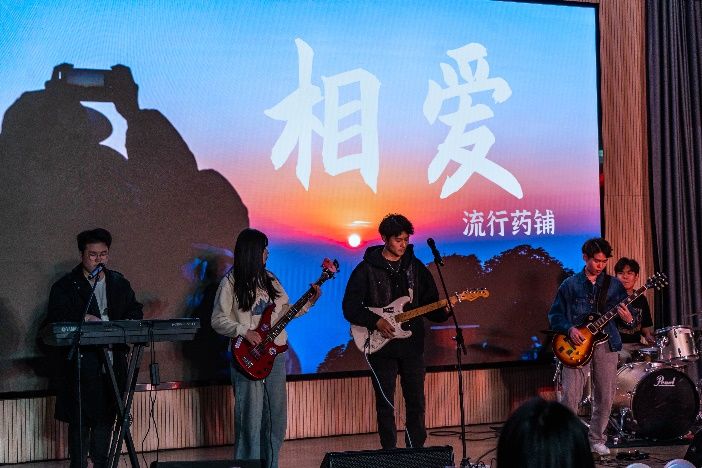 吉他协会的流行药铺乐队带来演唱《相爱》与《花火》,歌声、鼓点、琴声激荡在春日晚风中,一切关于青春的梦与爱都在这个夜晚珍藏。