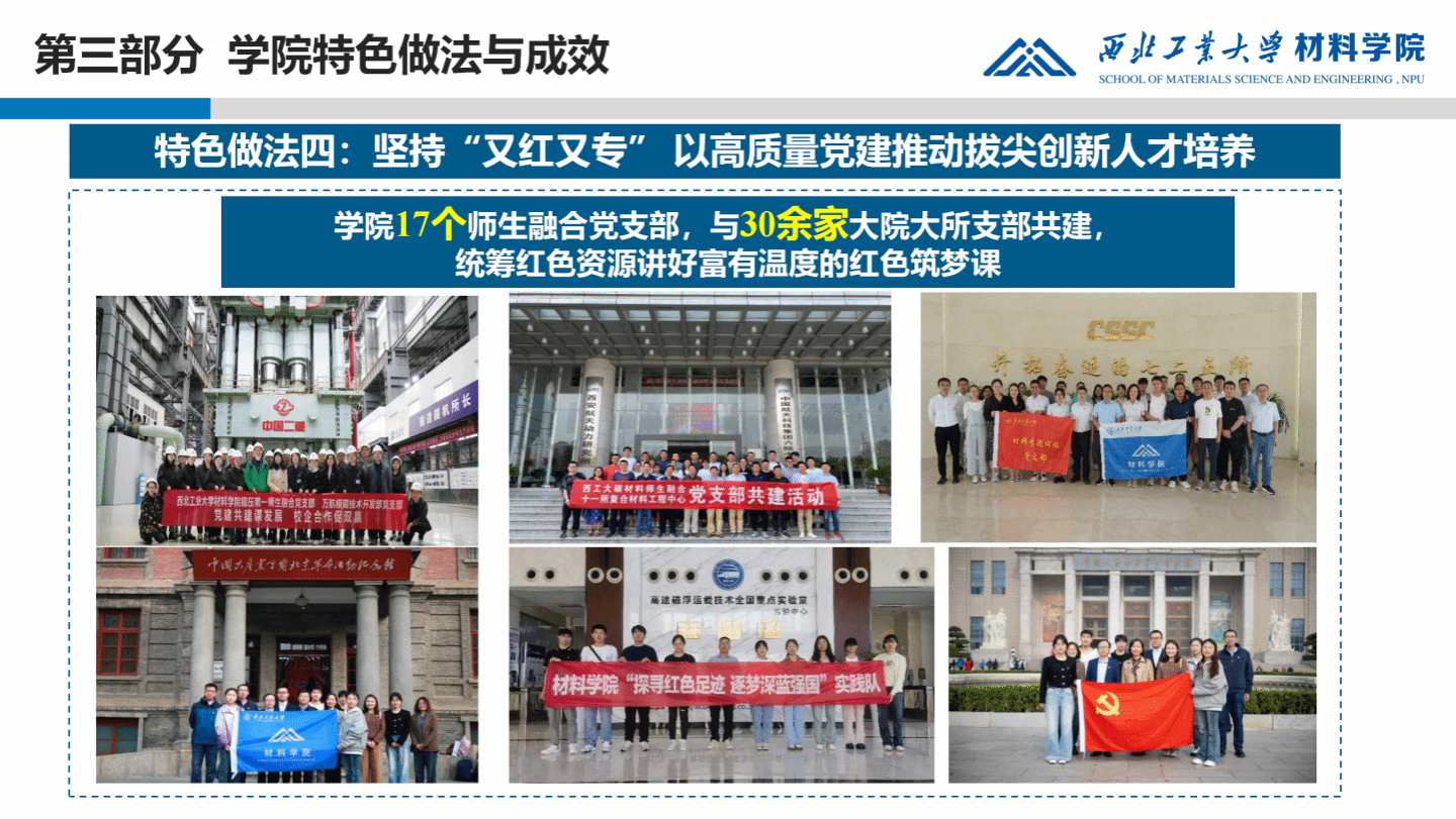 与中国航空制造技术研究院、中国航空工业集团公司北京航空材料研究院、中国航天科技六院十一所等30家院所、企业等开展校企支部共建,开展认知-生产-项目式“三阶段”实习,使学生身临其境感受科研成果助力大国重器研制和社会经济发展,培养学生投身军工事业的家国情怀。将实践育人、服务育人与组织育人有机结合,融入人才培养全过程,依托延安、照金等丰富红色资源,开展“走初心之路,点亮红色中国”实践教学,打造爱国主义实践“金课”;开展同心抗疫、爱心支教、乡村振兴等特色活动,打造志愿服务和社会责任实践“金课”,提升群团工作成效。坚持党建带团建,引领广大青年高举团旗跟党走,青春建功新时代。近3年,JavBus
