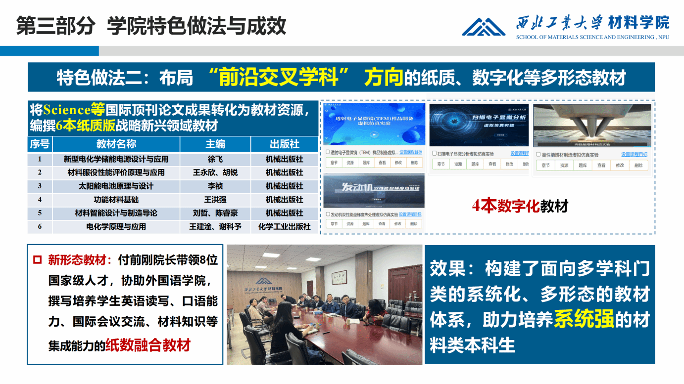 1.挖掘国防元素的大师课,完善材料类AI赋能数字化的典型案例库,构建中学-本研贯通培养机制。积极探索拔尖创新人才培养路径,完善本研贯通培养模式。加大优质育人资源的投入力度,提升教师数字化素养,挖掘优秀教学案例,建设一批以知识图谱、AI课程等新形态应用为主的一流数智课程/教材,打造一批具有国防特色的精品教学课程/教材。