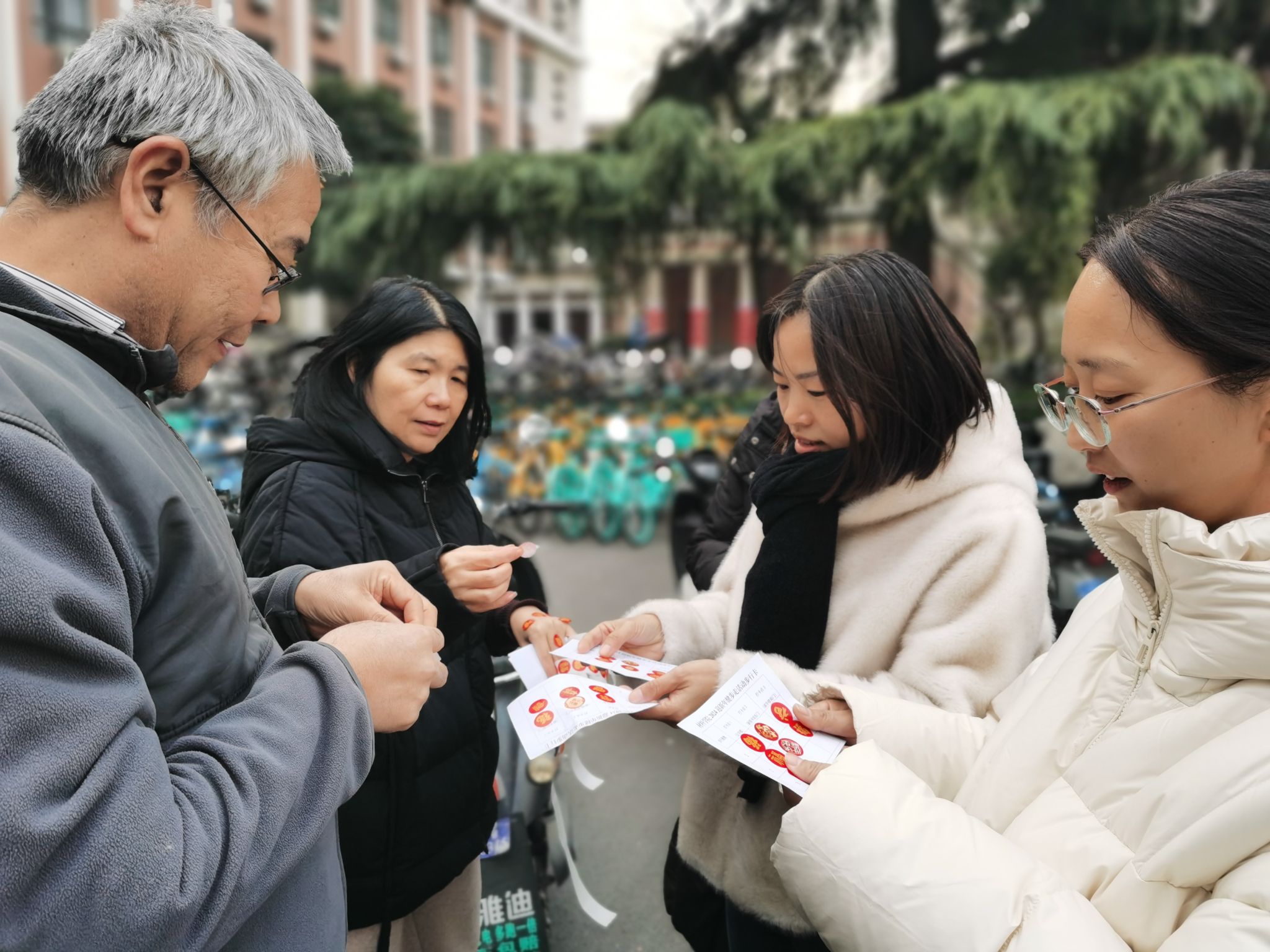 健步走环节从公字楼前出发,沿教学南路和教学北路环绕三圈,在公字楼、新图书馆东门、诚字楼南门三处设打卡点,每到一处步行卡上贴一个小福贴,集满9个小福贴,可进入抽奖环节,也寓意久久幸福。