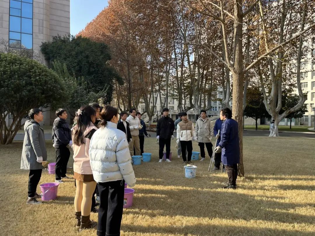 后勤集团工程服务中心贾师傅详细介绍了树木刷白的相关知识和注意事项,指导支部师生对新图书馆前的树木进行刷白。