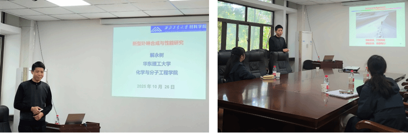 10 月 26 日,华东理工大学解永树教授做客领军讲堂第 41 期,作《新型卟啉合成与性能研究》报告,报告会由谭丽丽副教授主持。解教授系统介绍了卟啉的独特特性与应用前景,分享了共轭结构调控、新型异卟啉合成等方面的创新策略,为高效太阳能电池开发等提供理论支撑。会后,谭丽丽副教授、薛语萌副教授与解教授深入交流,解教授还为同学们解答了单晶生长、电池效率影响因素等相关疑问。