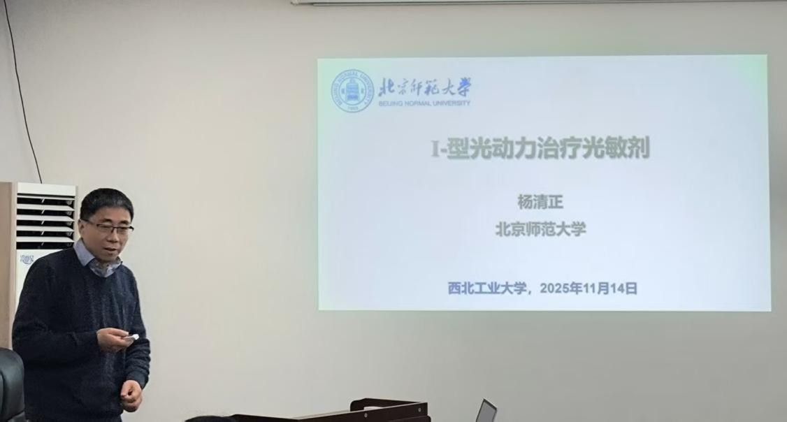 随后,杨清正教授作题为《Ⅰ-型光动力治疗光敏剂》的报告。杨清正教授详细地阐明了光动力治疗的过程及原理,分析了Ⅰ-型光敏剂在乏氧肿瘤治疗中的优势,系统讲解了构筑Ⅰ-型光敏剂的原则及方法。通过分子设计降低三线态的能量,使其选择性通过I-型途径生成超氧阴离子;通过分子组装的方式引入电子给体或受体,提升电子转移效率,实现了Ⅱ-型到I-型光敏剂的转变。
