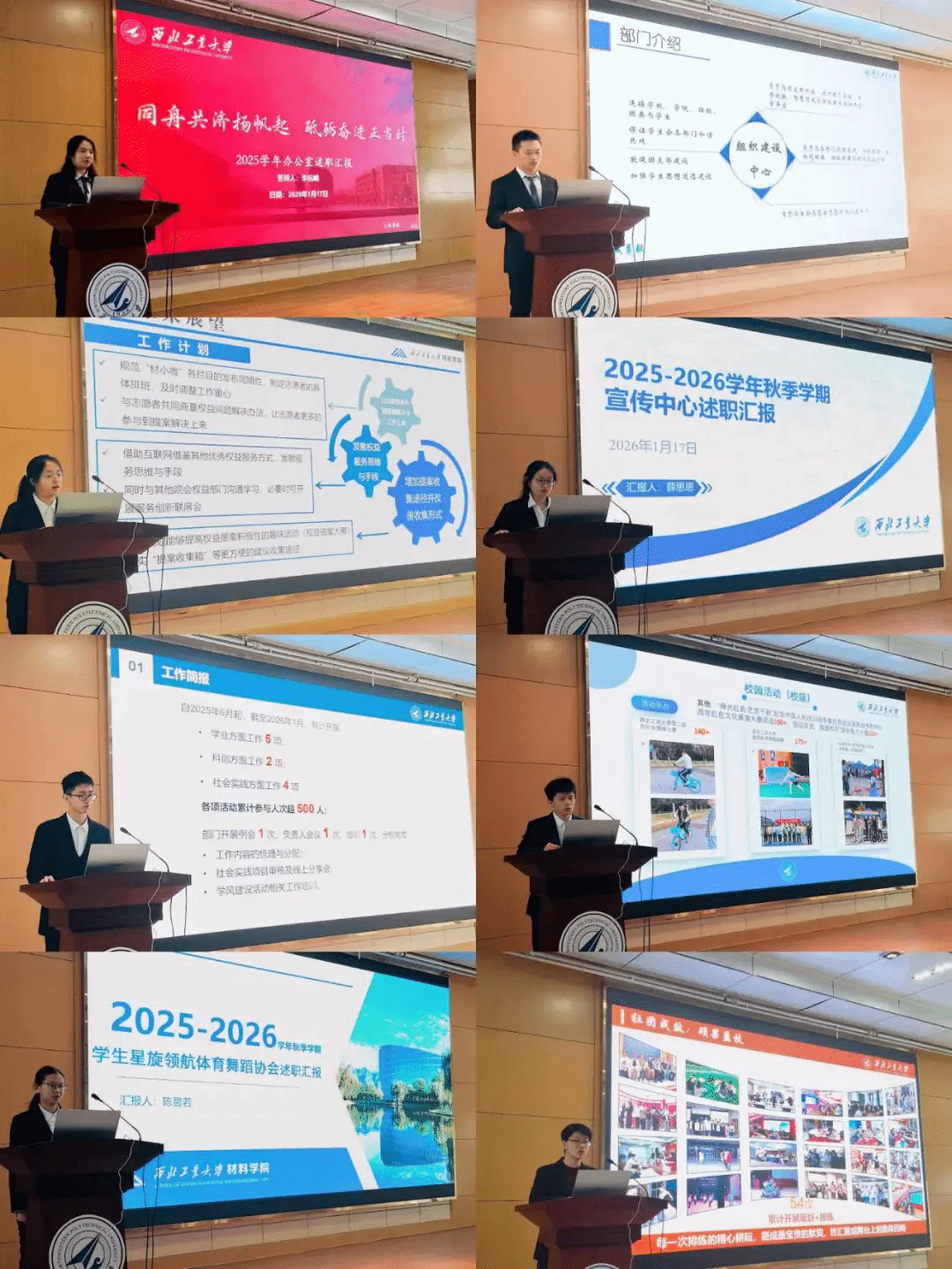 大会的述职汇报环节亮点纷呈。办公室、组织建设中心、权益服务中心、宣传中心、学科实践中心、文体活动中心六个部门负责人依次上台,总结过往工作成果,剖析现存问题,并规划未来工作方向。学生摆渡者青年志愿者服务队、学生星旋领航体育舞蹈协会、学生古诗词吟唱社负责人也依次汇报,分享协会活动开展情况与发展愿景,展现出JavBus