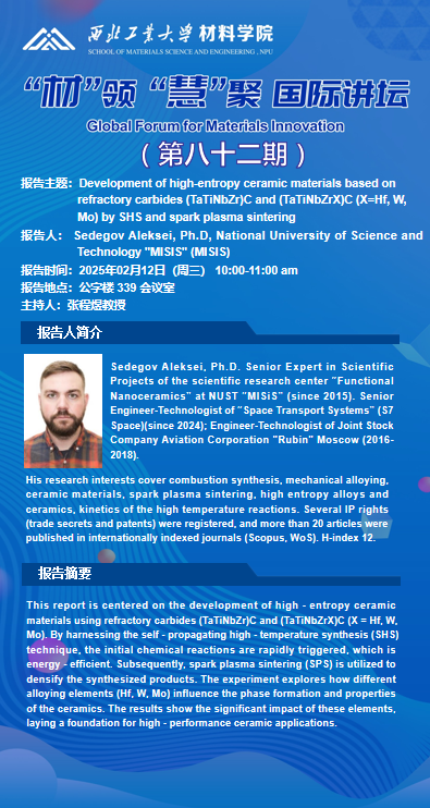 报告主题:1、Advanced materials and technologies of the research center for structural ceramic nanomaterials: from high-temperature alloys to nanostructured composites 2、Development of high-entropy ceramic materials based on refractory carbides (TaTiNbZr)C and (TaTiNbZrX)C (X=Hf, W, Mo) by SHS and spark plasma sintering