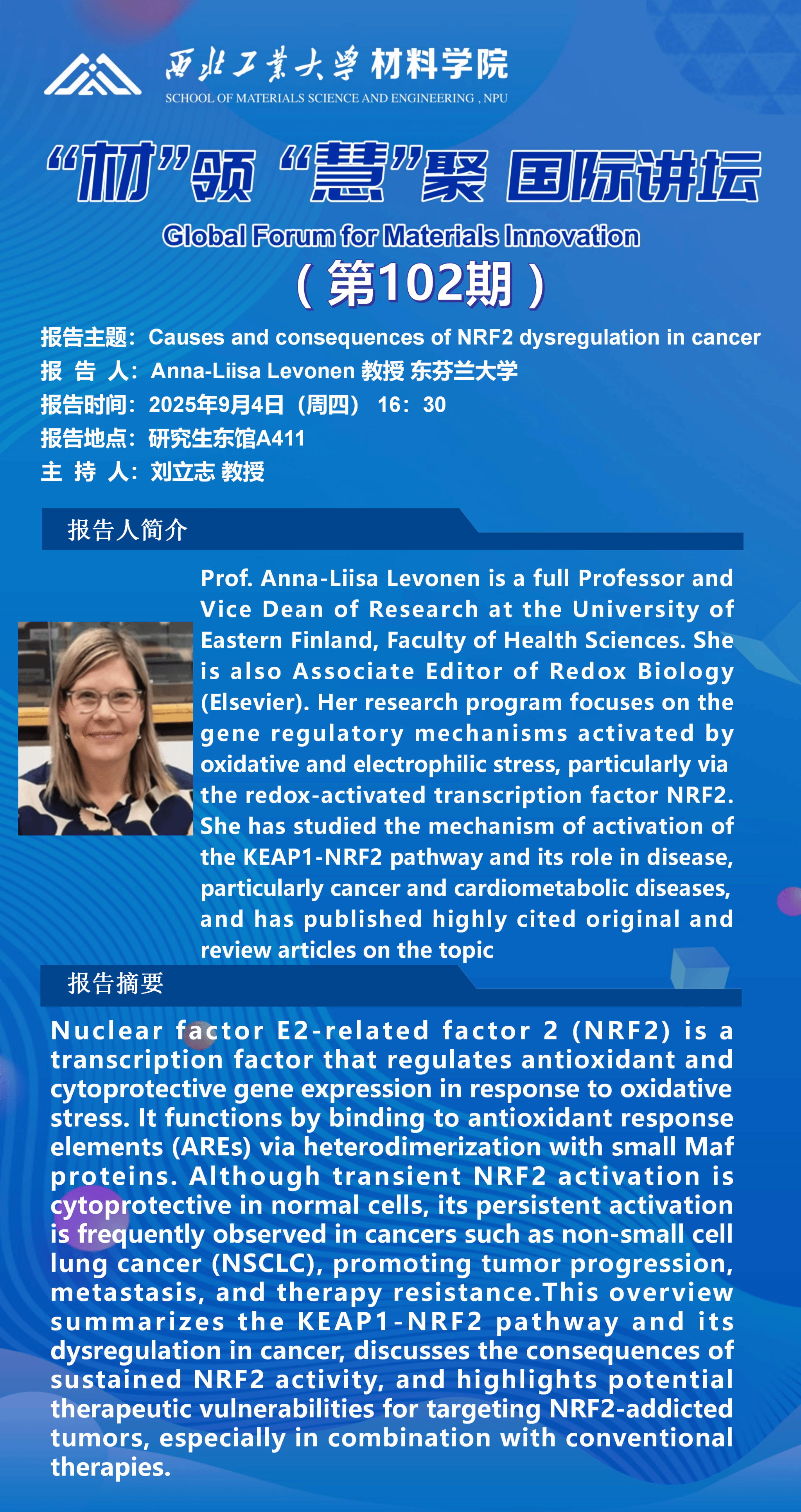 国际讲坛:Silicon nanovectors enabling combination therapy and bioimaging;Causes and consequences of NRF2 dysregulation in cancer;Bioinspired porous nanoparticles for biomedical applications